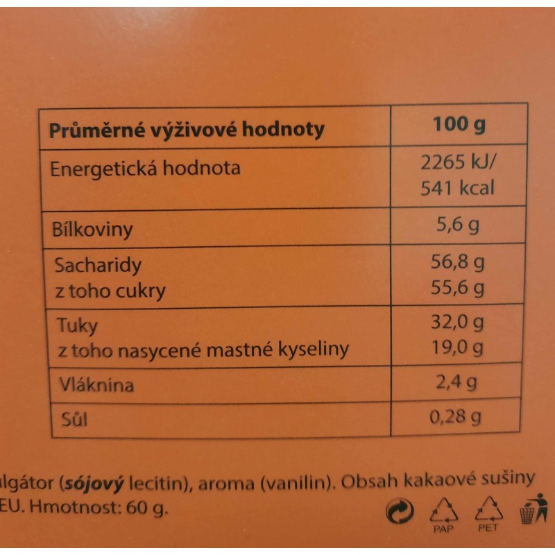 Obsah kakaové sušiny nejméně 33%. Obsahuje výrobky z mléka a sóji, může obsahovat stopy skořápkových plodů. Vyrobeno v EU. Hmotnost 60g